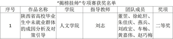 获奖作品《陕西省高校毕业生中未就业群体的成因分析及对策引导》由beats365唯一官方网站法学系刘志教授指导,研究生董翌、徐屹轩、朱佳庆、燕兵、刘政宏、车畅、黄嘉伟、赵巧梅共同完成。作品聚焦高校毕业生就业问题,探讨在日益严峻的就业形势下,如何“实现更加充分高质量就业”的目标,作品以陕西省高校毕业生为研究对象,通过分析他们的就业结构、工作单位类型、毕业去向以及对工作薪资福利的期望,探究影响高校毕业生的就业因素,并结合法学专业提出有针对性的建议。