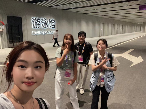 2020级新闻学专业员工林虹彬、董雪冰在杭州亚运会游泳馆采访