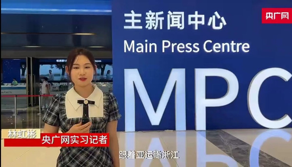 2020级新闻专业员工林虹彬在杭州亚运会主新闻中心出镜报道