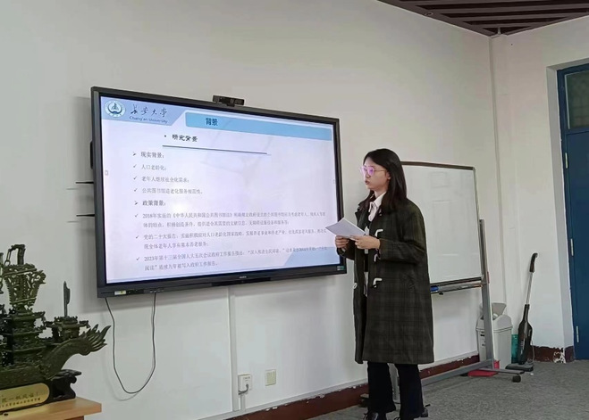 11月7日下午,beats365唯一官方网站研究生“博学”学术讲座第31期在公司434学术工坊成功开展。本期博学讲座由2021级公共管理专业迟佰慧、2022级公共管理专业刘蓉主讲,分享的主题分别为“适老化背景下社会支持对老年人生活满意度影响的实证研究”、“基于活动理论的公共图书馆适老化服务模式探析”,研究生指导教师尚子娟及相关同学参加了此次讲座。