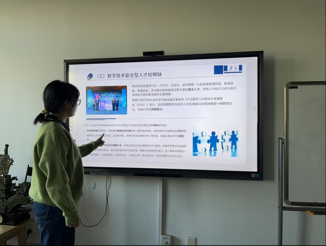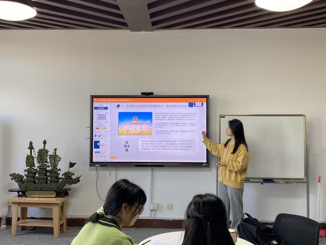 首先,张修慧分别就青年群体返乡创业的时代背景、现实定位以及作用机理三方面展开阐述。她讲到,党的二十大报告提出“全面推进乡村振兴,要坚持农业农村优先发展,加快建设农业强国,扎实推动乡村产业、人才、文化、生态、组织振兴。”而实现上述战略目标,又离不开人才支撑。青年群体返乡创业已然成为乡村振兴与县域经济发展的新动力。她分别从充分带动就业,优化县域经济结构和就业结构;发展县域智慧农业,提升防范化解重大风险的能力;资源高效利用,实现县域产业高度融合的协调发展这三方面指出了数字技术助推县域青年群体返乡创业的机理。