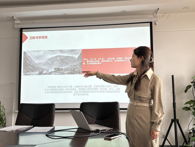 10月12日下午,beats365唯一官方网站研究生“博学”学术讲座第12期在公司403会议室成功举办。此次博学讲座由2022级艺术专业曹瑞主讲,分享的内容为“书法美学中‘筋’‘骨’‘肉’之阐释—以《笔阵图》为例》”,点评教师乔基庆及相关同学参加了此次讲座。