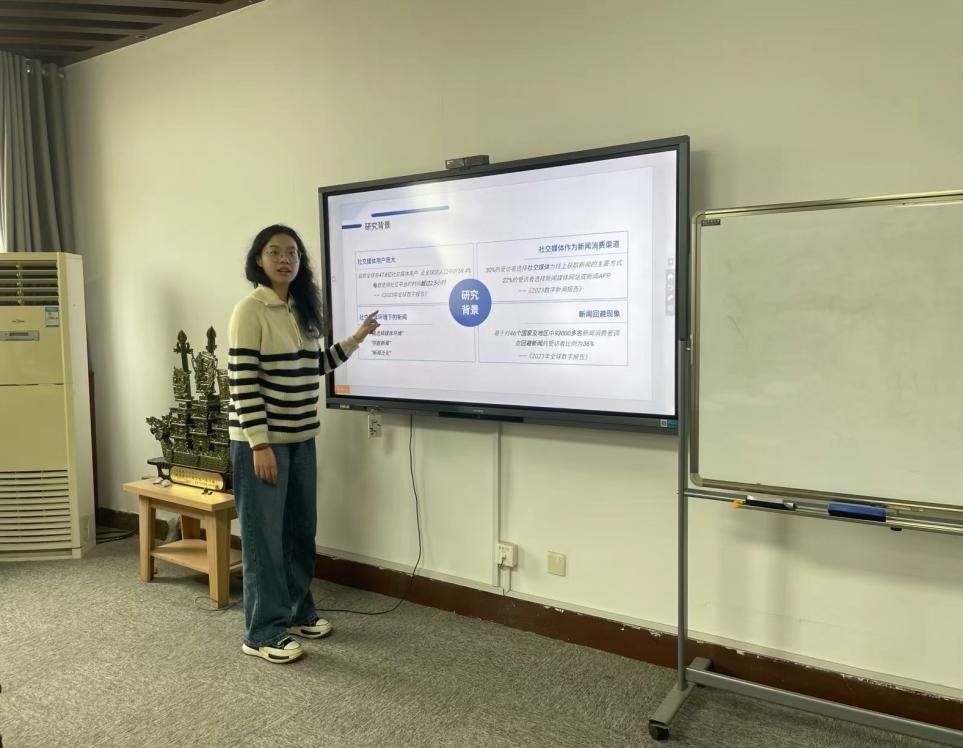 接着,孟春晓以“社交媒体用户的新闻回避行为研究”为议题,她首先介绍了当前社交媒体用户存在的新闻回避现象,并针对这一现实背景提出研究问题。通过深度访谈挖掘社交媒体用户新闻回避行为产生的原因,引入感知价值理论构建了社交媒体用户新闻回避行为的影响因素模型。她进一步采用问卷调查的方法来收集数据,通过实证分析探究感知价值各维度是如何影响用户的新闻回避行为的,基于以上研究在最后提出研究启示与展望。