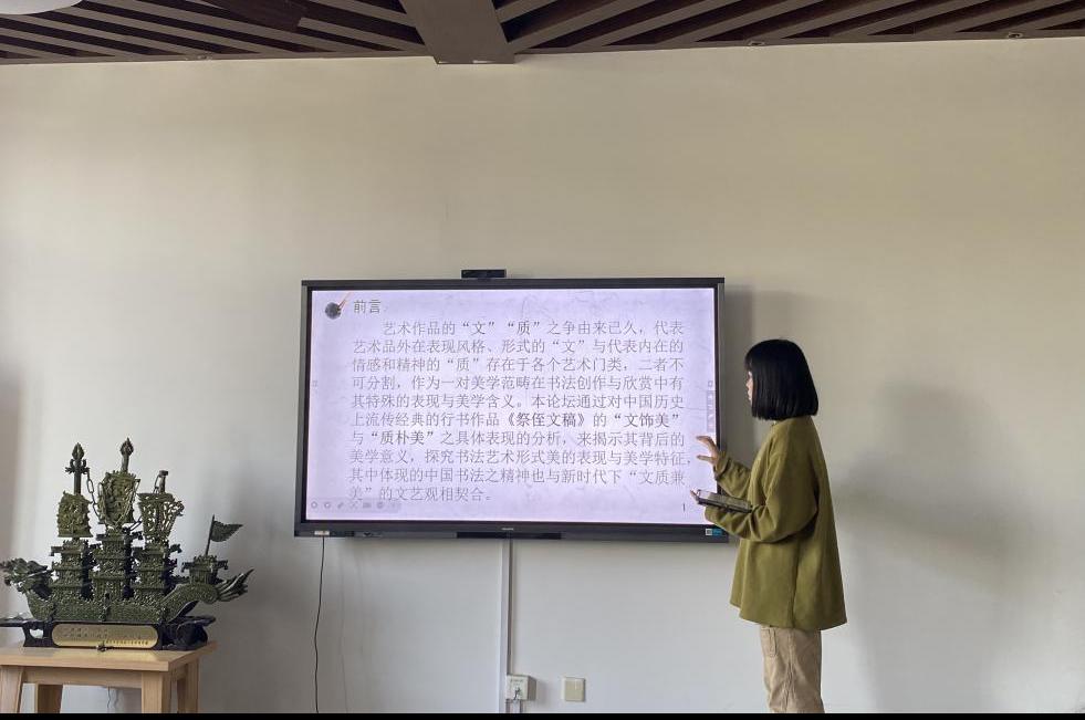 黄婉佳以中国传统美学范畴中的“文”“质”为切入点,分析了颜真卿的书法作品《祭侄文稿》中的“文饰美”以及“质朴美”的表现,具体包括作品的线条所表现的“气”与“力”,书法的章法和布局所表现的时空与动静问题,以及作品“质”层面体现的情感的自然性与书家的人格精神之“善”。随后她通过《祭侄文稿》具体讲解了当下文质兼美的文艺观。