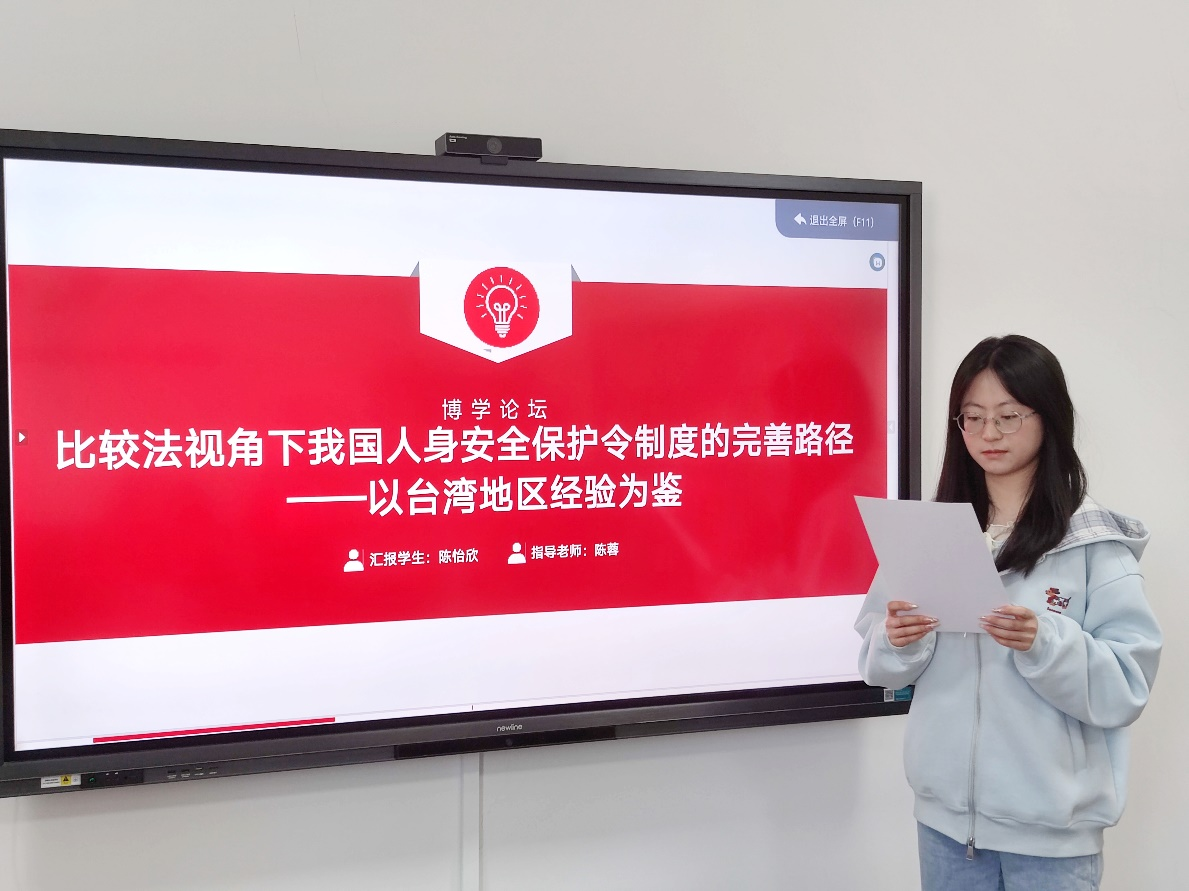 陈怡欣以“比较法视角下我国人身安全保护令制度的完善路径——以台湾地区经验为鉴”为题展开分享。她围绕人身安全保护令制度的实施现状,提出了研究思路。她通过对人身安全保护令法律属性的双重厘定来分析人身安全保护令在我国的现实处遇厘清现实痛点。通过考察台湾地区“家庭暴力防治法”的立法与实践,陈怡欣指出我国人身安全保护令完善路径,即:丰富保护令内容、简化申请程序、优化证明规则、加重违令处罚力度。通过借鉴台湾地区的经验她希望能更好的完善人身安全保护令制度,实现其应有的价值,有效控制家庭暴力带来的伤害。