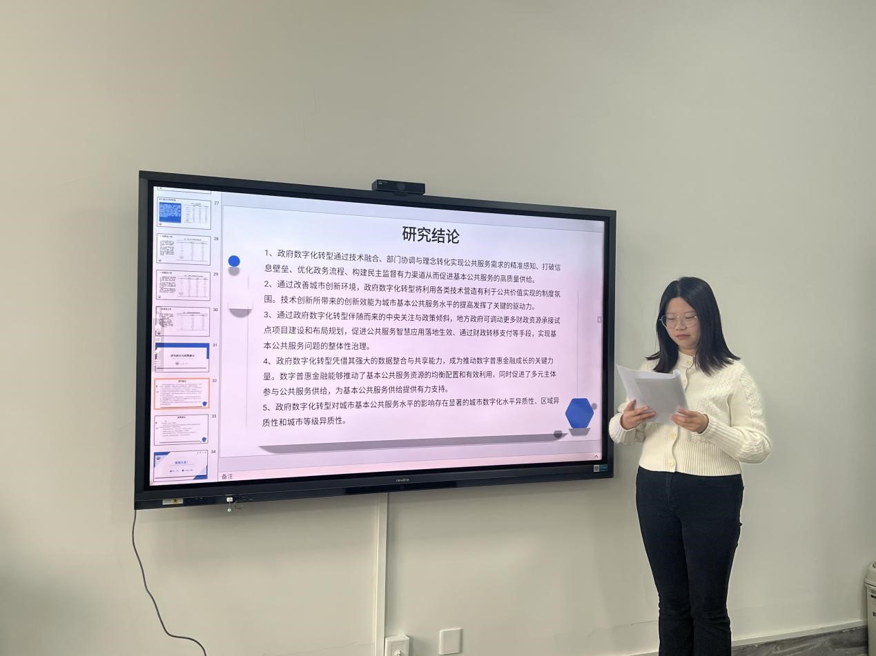 指导教师范丽莉对三位同学的分享分别进行了点评,并就研究内容中存在的问题进行了指导。本次讲座通过量化研究与案例分析相结合的方式呈现了数字化治理转型相关研究的前沿动态。