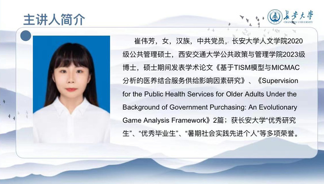 崔伟芳目前在西安交通大学公共政策与管理公司攻读博士学位。分享会上,她首先为大家解读了申博与考研的不同点。之后,她结合自己的申博经历,在联系目标院校导师、简历制作以及邮件发送等方面对与会同学提出了对应建议。她强调在申博过程中,首先要在目标院校官网查找往年招生简章,通过往年招生目录查看招生博士生导师名单,且博士申请不要局限于一所院校;二是要认真准备申博材料,注意所需材料种类、提交方式以及截止时间等信息,并以西安交通大学共政策与管理公司2023级博士招生简章为例进行讲解;三是要高度重视复试,在专业课和英语笔试环节可咨询目标院校师兄师姐,把握考核重点。分享会最后,崔伟芳向与会同学分享了公众号“考博之路”,希望对大家之后的求博之路有所帮助。