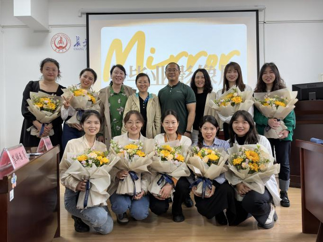 展映伊始,影视学科召集人张燕梅老师对首届“Mirror”研究生毕业影像展进行了简要介绍,并宣布此次展映将作为研究生毕业常态影展每年举办。随后,现场师生一起参观了参展的10部短片的电影海报墙,并观看了所有作品的精彩预告片。此次展映作品一改以往员工视角的限制,内容涉及乡村青少年教育、女性创业、养老问题、两代农民工交迭、背包客、流浪歌手等题材,以较为娴熟的视听语言将社会百态及人性的幽微呈现出来。在场的导师还一一为十位毕业生送上鲜花,祝贺同学们在三年的学习生活中取得的不凡成绩,祝福大家在未来的创作中闪闪发光。