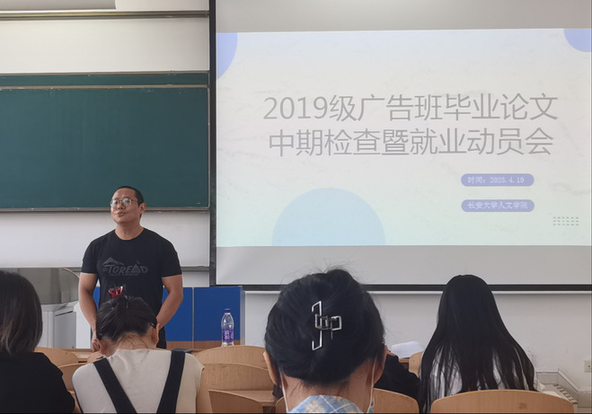 2023年4月19日上午,best365英国在线体育官网2019级广告班毕业论文中期检查答辩暨就业动员会在鸿远教学楼WH1102顺利召开,全体广告学系教师和2019级广告班员工参加了会议。