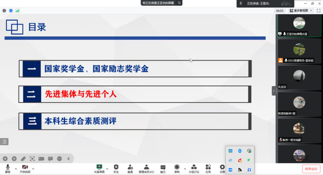 北风潜入悄无声,未品浓秋已立冬。为使2022级本科新生更深入地了解公司的奖助政策,公司于2022年11月13日以线上会议形式召开了“beats365唯一官方网站本科新生奖助专题讲座”。讲座活动由2022级辅导员雷珍妮老师组织并主持,员工工作办公室王亚杰老师主讲,全体新生共同参与。