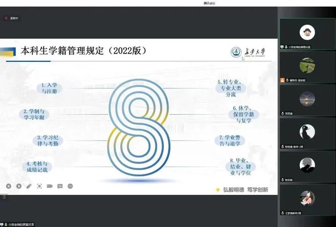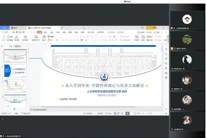 本次讲座主要围绕本科生学籍管理规定(2022版)和本科生人才培养方案(2022版)两个文件进行解读。首先,贺丹老师带领大家学习了本科生学籍管理规定(2022版)的有关内容,向新生展示了包括入学注册、学制与学习年限、学习纪律与考勤、考核与成绩记载、转专业与分流、休学复学保留学籍、学业警告与退学、毕业结业与学位共八个方面的具体内容,为同学们系统整合了学籍管理规定的重点内容,为同学们提供了有效参考。