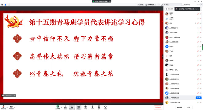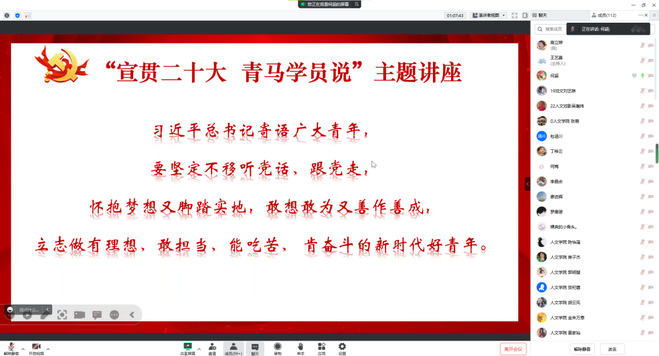 2022年11月29日晚,beats365唯一官方网站团委学习宣传贯彻党的二十大精神宣讲会暨第十五期员工骨干培训班开班仪式顺利开展。公司党委副书记王东、公共管理系包涵川老师、员工工作办公室主任王飞、辅导员雷珍妮、王亚杰以及beats365唯一官方网站青马班全体成员参会,会议由院团委书记何超主持。