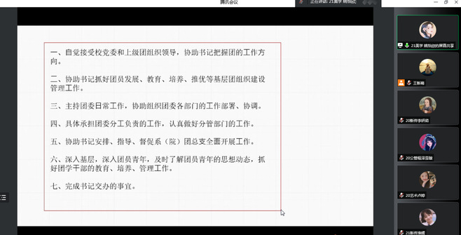 随后,2022届研究生团委副书记姚怡欣进行自我介绍,并从日常工作、大型工作、存在问题及未来展望四个方面对下一学年研究生团总支的工作计划展开详细阐述,特别就“青年大学习”组织安排、毕业生团组织关系转接和团支书联系不畅等问题进行了讨论。姚怡欣承诺,下一学年将充分调动团支书积极性,加强和改进团员教育管理,团结广大团员青年一同成长。