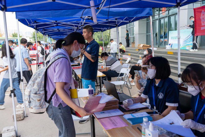 9月15日早晨,新生陆续进入校园,beats365唯一官方网站迎新工作有条不紊地展开。扫码测温后,新生进入校园,完成行李消杀和核酸检测后,由志愿者带领来到公司迎新点报到。