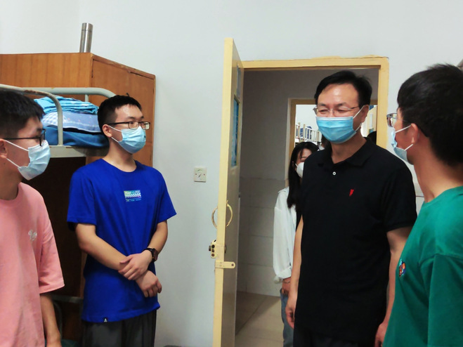 下午,公司党委书记王景荣到帐篷点指导慰问。随后,王景荣一行深入走访新生宿舍,了解了新生们的习惯需求,并就疫情防控、宿舍关系和安全等问题与同学们沟通交流,耐心答疑解惑。