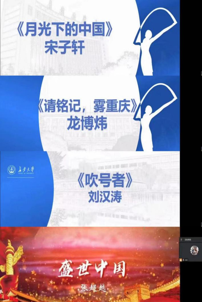 分享会最后一个环节,特邀四位同学进行朗诵。首先是宋子轩同学带来的朗《月光下的中国》,在他豪迈的嗓音中,全体与会人员感受到了我国大好河山之美;龙博炜同学带来的《请铭记,雾重庆》,将同学们带回了那个战火纷飞的年代,虽然现在的中国越来越好,但我们也不能忘记历史,身为新时代青年,我们应当铭记历史,奋发向前。最后,刘汉涛和张超越同学分别带来朗诵作品《吹号者(节选)》和《盛世中国》!