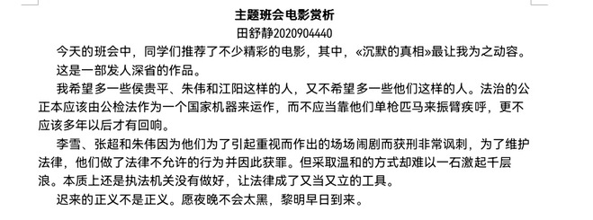 分享结束后,田舒静、李春昊、李驰缘三位同学分享了她们的观后感,表达了她们对于电影的感受与理解,呼唤了她们心目中真正的公平正义,在电影中体会到了人性的弱点与光辉,并寄托了自己作为法学人的未来期许。