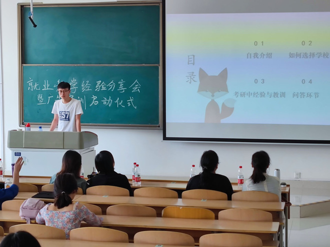 首先,考入华南理工大学的田敏洁学姐从坚定目标、择校技巧、备考技巧、心态调整四个方面给同学们提出了建议。从自己的考研经历出发,学姐建议考研的同学结交志同道合的朋友一起努力学习。考入武汉大学的吴雨含学姐详细介绍了专业课的备考节奏和备考建议。她提出,文科的学习,从入门到熟悉再到掌握的过程实际上就是大量的知识输入的过程,要循序渐进的学习,不要妄自菲薄,也不要着急。具有跨考经验的武潇辉学长分享了自己的独特经历,细心的学长展示了考研录取名单和自己的考研作息,同时分享了专业考研中外语(日语)学习与复试经验。