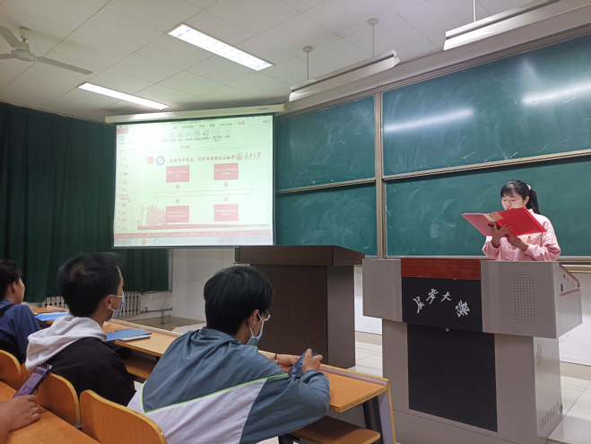 然后,吴文娜同学带来宣讲——《从长津湖畔看中国精神》,以电影《长津湖》中的一个片段为切入点,引出中国精神这一概念,通过讲解,带领同学们在一个个故事中寻找属于中国人的独特精神。
