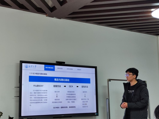 刘昊霖分享了定性比较分析法(QCA)的应用与操作。主要包括以下四个方面:QCA方法的概念与理论基础;QCA方法的一般步骤与论文框架;运用QCA方法的注意事项;操作演示。首先,他通过计量可视化分析呈现出使用QCA方法论文的发文趋势及涉及学科领域,指出该方法的前沿性及了解学习这种方法的必要性;同时讲解了QCA的起源与发展,QCA的概念、理论基础以及其与传统定量研究和定性研究方法的区别,又针对QCA方法的特点、优势及三种常见分类进行解读。其次,他以《管理世界》中公共管理领域的高质量论文为例,为大家讲解QCA方法的基本操作步骤以及论文的一般框架结构。最后,刘昊霖分享了QCA方法运用中的注意事项,包括真值表格式问题、QCA图示如何绘制、步骤要求、方法缺陷等进行详细的解读。还分享了fsQCA软件下载方式,并借助该软件进行简单操作演示。