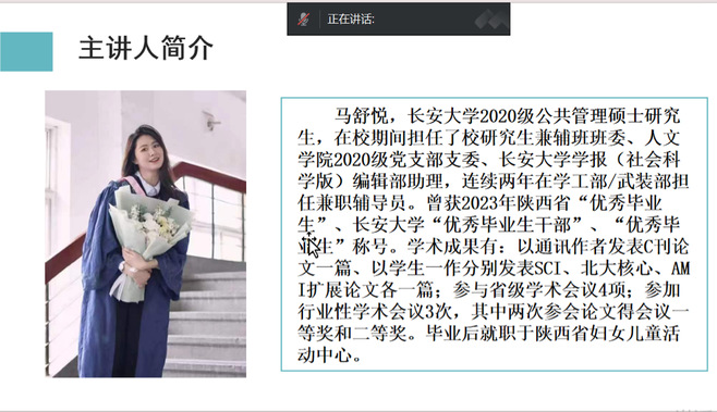 马舒悦同学目前就职于陕西省妇女儿童活动中心。分享会上,她从事业单位笔试、面试等方面为大家进行经验分享。首先,在时间安排方面,九、十月是准备国考考试的黄金时间,她建议同学们多挑选仅限硕士生的岗位,这相较于其他岗位而言会有更多优势。其次,在笔试方面,她推荐多进行习题练习,在备考过程中多看视频课程,要注意逻辑思考而不仅仅局限于盲目的练习。最后,在面试方面,她强调考前的练习尤为重要,要清楚答题套路并紧抓关键词进行回答,多关注新闻热点、多背答题金句。
