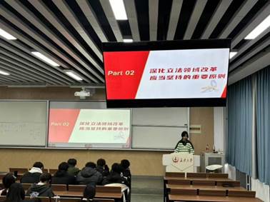 首先,刘可儿带领全体团员学习了党的二十届三中全会精神内涵,随后,她结合全会关于深化立法领域改革的内容,重点讲述了改革和法治双轮驱动的重要性、深化立法领域改革的重要原则以及目标任务要求,加深对深入学习贯彻党的二十届三中全会精神,坚持全面依法治国,推进中国式现代化的理解。