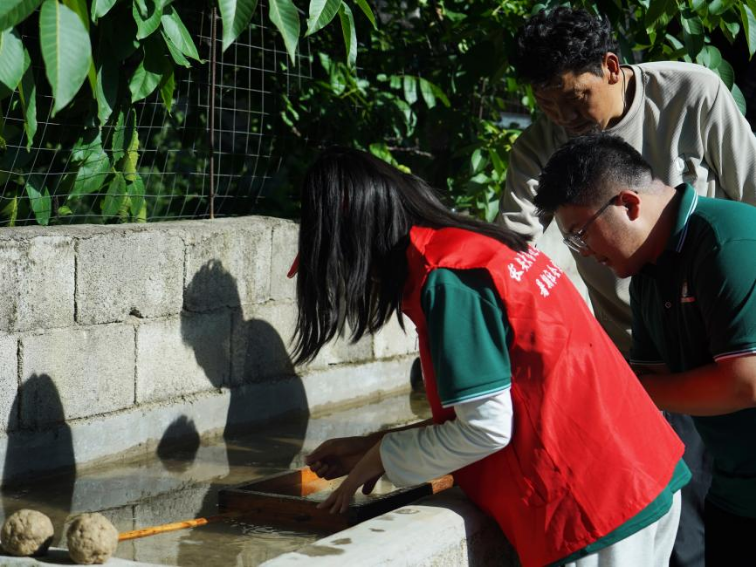 实践团队前往白水台景区和东巴文化体验馆,感受当地文旅融合的显著成效,还拜访了当地政协委员、非遗传承人和树昆先生。在院子外的空地上,和老师和他的团队们手拉着手,在歌唱与舞蹈中与古老文化对话。此外,和老师带领同学们亲手体验造纸非遗,采集原料、晒干、浸泡、蒸煮、漂洗、舂料、抄纸、晒纸……东巴纸制作的数十道工序犹如一幅画卷在实践队员眼前徐徐展开。