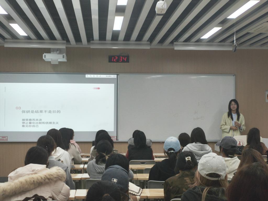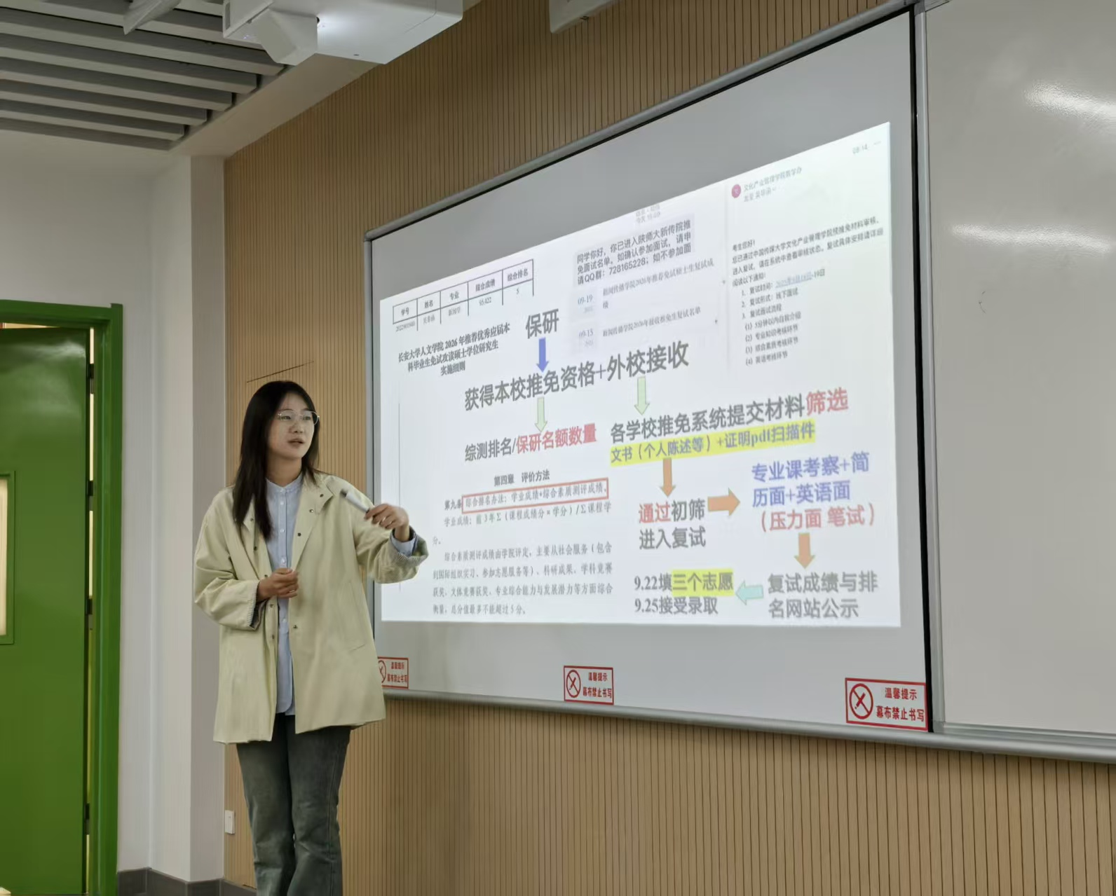 活动伊始,吴非函同学详细分享了自己的专业学习方法、科研竞赛经历以及实习体会。随后,她围绕“保研全流程解析”展开分享,从推免资格获取、材料准备到面试环节,全面梳理了每个阶段的关键要点与可能遇到的“坑”,为同学们提供了宝贵的实践参考。