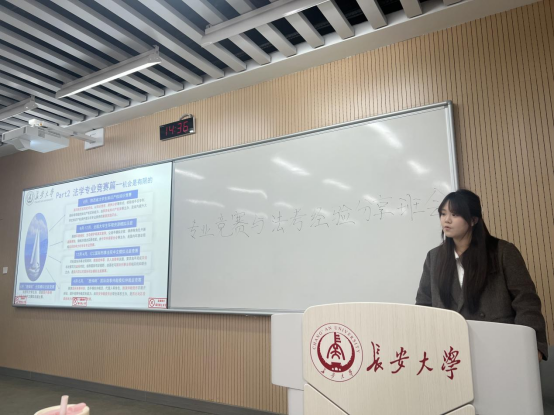 随后,张学静同学以“法律职业考试备考经验”为主题,从备考规划、学习经验、名师分享等诸多方面,向同学们提供了丰富实用的备考策略。她直言,法考是每一位法员工的成人礼,对于法员工的发展规划异常重要,鼓励同学们树立长期学习意识,劳逸结合,把理论知识真正化为己用。