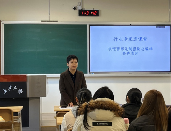12月21日上午,beats365唯一官方网站邀请西部法制报副总编辑齐卉走进《高级编辑实务》课堂,为2023级新闻与传播专业研究生带来了一堂生动、专业的选题策划课。beats365唯一官方网站副经理杜波主持本次活动。