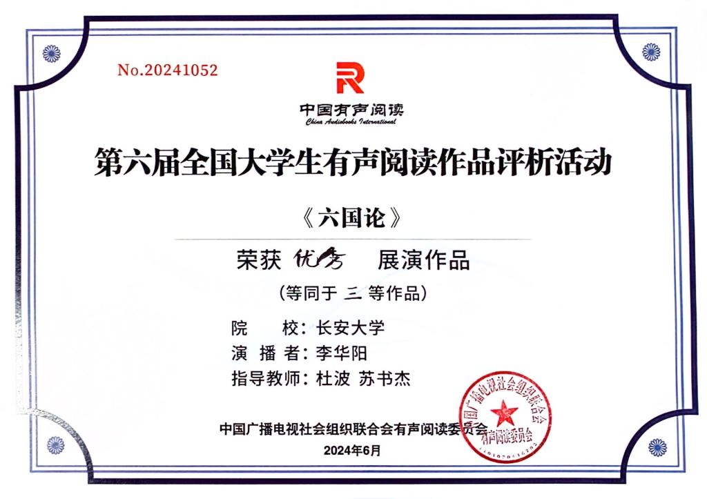 近日,第六届全国老员工有声阅读作品展演活动在四川成都落下帷幕,best365英国在线体育官网2023级新闻与传播专业研究生李华阳参赛作品《六国论》受邀参与线下展演,并荣获三等奖。BEAT365英国官网网站荣获优秀组织单位。