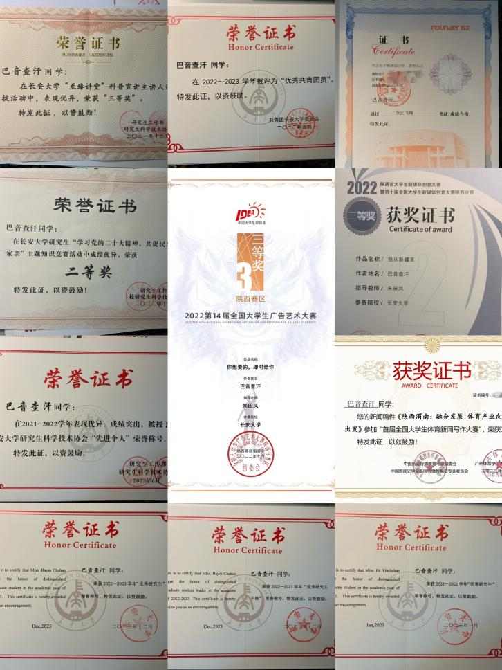巴音查汗在校期间,始终保持着对学术研究的热情与专注。她学习成绩优异,研一学年专业成绩排名第一,连续两年获得校级一等学业奖学金。她不仅专注于课本知识,还积极投身科研项目,在导师的指导下,获得了一定的学术成果。同时,巴音查汗擅长视频剪辑与美工制作,利用个人特长她踊跃参与学科竞赛,曾获得2次省级学科竞赛的荣誉。