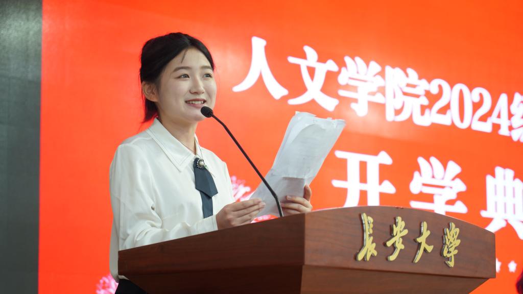 2024级广播电视编导专业王蕴甜同学作为新生代表发言。她先向各位老师和学姐学长表达了感谢,并讲述了军训的体悟。同时,向全体新生提出三点倡议:树立理想,明确目标;勤奋学习,刻苦钻研;团结友爱,共同进步。