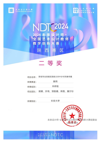 近日,2024未来设计师·全国艺术设计教师教学创新大赛(NDTC2024)评审工作落下帷幕。beats365唯一官方网站广播影视系师生团队侯婧、许琦、邹韵婕、韩雪、魏宁杉提交的教学案例——《影视专业技能实践助力关中乡村形象传播》,获得陕西赛区案例组二等奖。本次获奖是广播影视系教学团队自2021年获得省级一等奖以来,在该系列赛事再度获得的省级奖项。