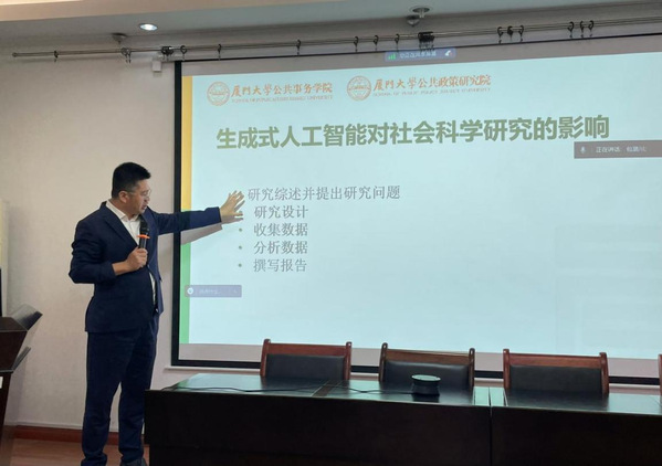 2023年11月5日,厦门大学公共事务公司经理于文轩教授莅临beats365唯一官方网站进行学术指导,并以“生成式人工智能与社会科学研究范式革命”为题给公司师生带来了精彩的学术报告。beats365唯一官方网站相关专业教师和全体研究生参加了本次活动,公共管理系全体本科生线上旁听。报告由公司党委书记杜智民教授主持。