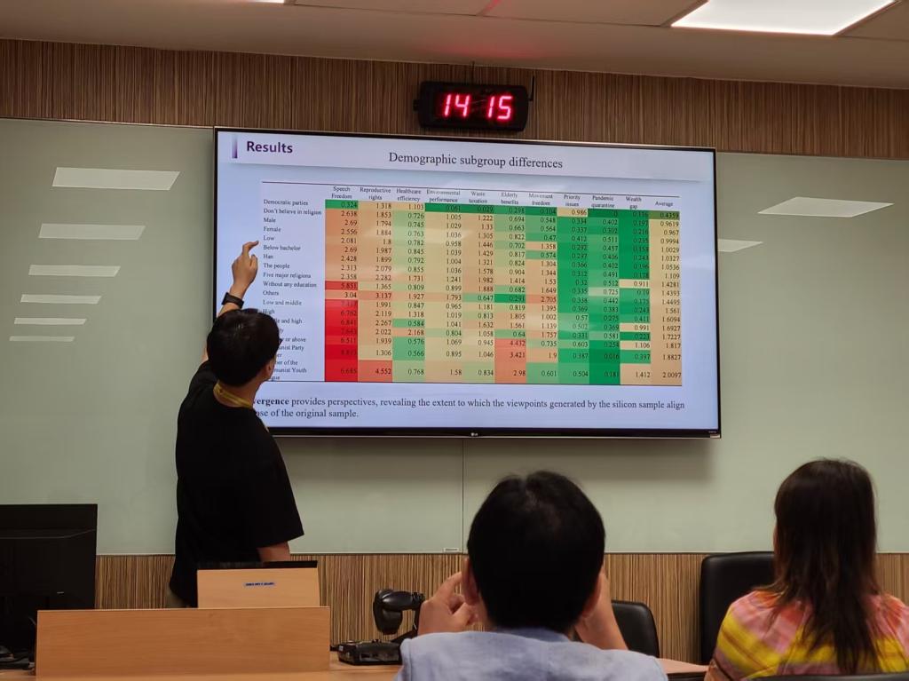 车少鹏博士在“Trust in AI and news media”分论坛发表了题为“Simulating the People’s Voice: Large Language Model Insights into Chinese Government Policies Based on Demographic Information”的学术报告。该研究聚焦在中国独特的社会政治语境下,探究大型语言模型在模拟公众对政府政策意见方面的实际效用。研究通过模拟不同群体的决策分布特征,为提升民意调查提供了新的切入视角,引发与会学者对“技术赋能舆情治理”的热烈讨论。