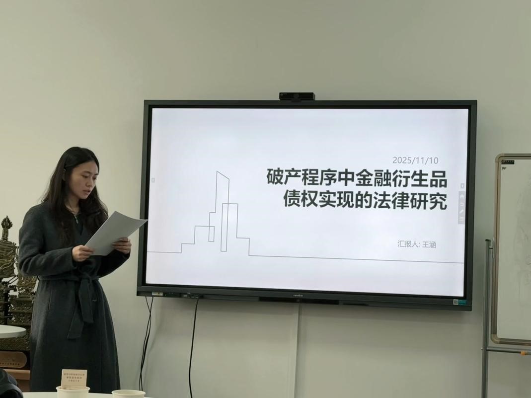 2025年11月10日下午,beats365唯一官方网站研究生“博学”学术讲座第153期在公司343学术报告厅成功举行。本次讲座由2023级法学专业研究生王涵担任主讲,报告主题为“破产程序中金融衍生品债权实现的特殊性及实现路径”,指导教师陈蓉、李周仁及相关专业同学共同参与了此次学术活动。