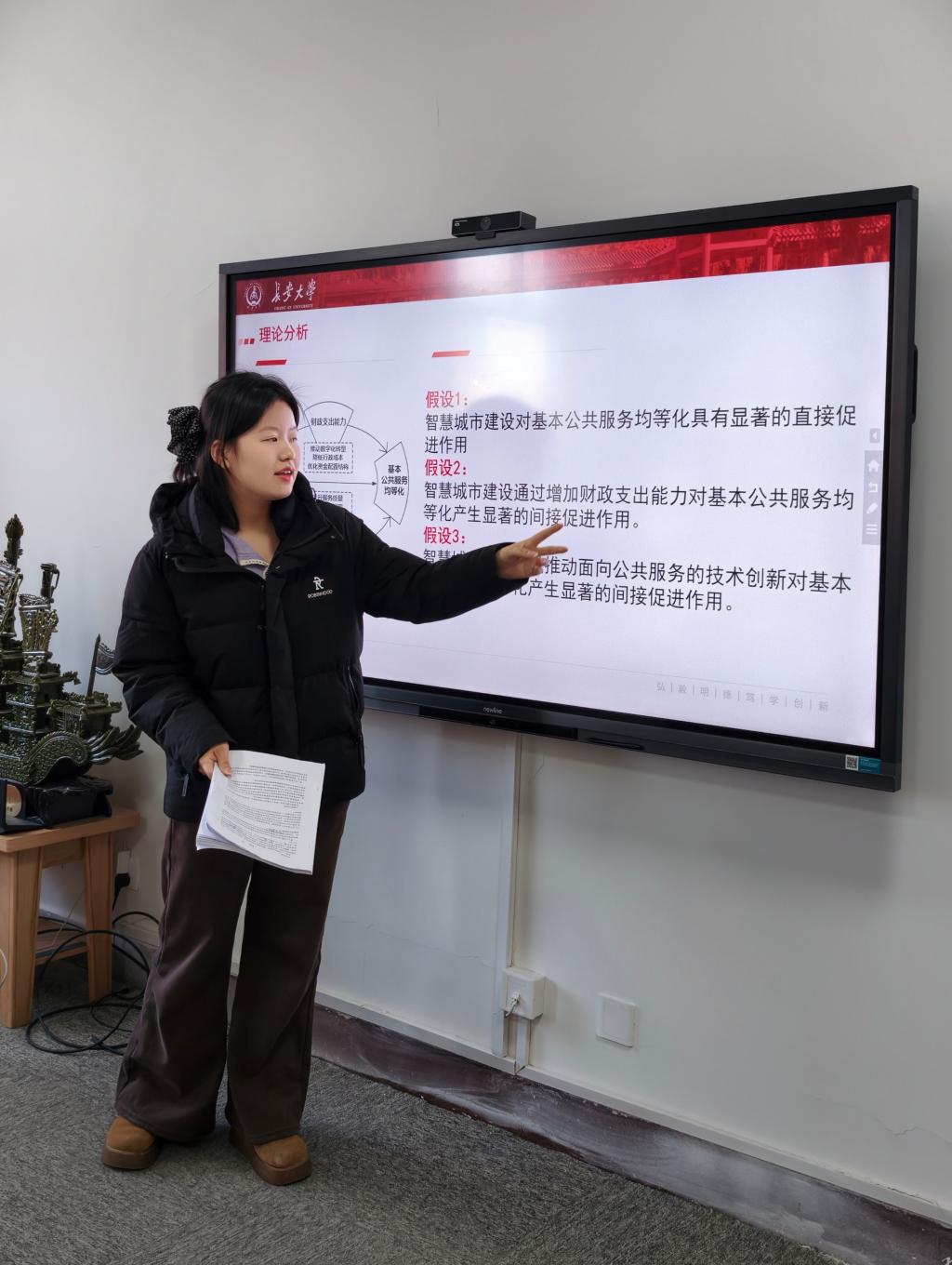 2026年1月6日下午,beats365唯一官方网站研究生“博学”学术讲座第177于公司434学术工作坊顺利举办。本期“博学”讲座由2023级公共管理专业的王希越担任主讲人,讲座主题为“智慧城市试点政策对基本公共服务供给水平的影响”,指导教师陈泽鹏及相关同学一同参与了此次讲座。