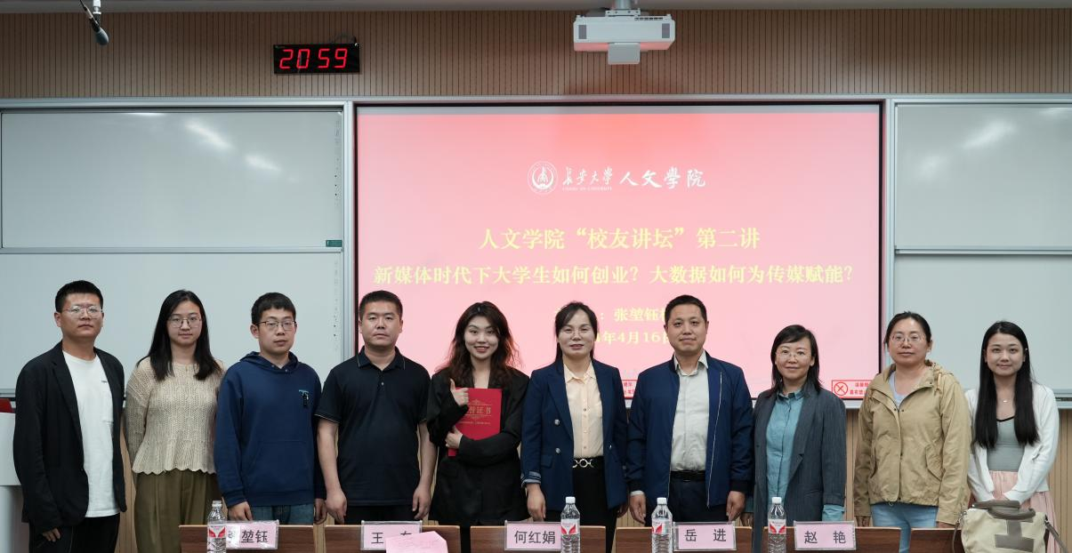 主讲嘉宾张堃钰员工,对公司、公司多年的培养表示由衷感谢。她表示在自己的创业征程上,老师们在校期间的教诲带给她不断前进的自信与底气,磨砺自我,坚毅前行。她从自身的创业经历出发,详细讲解了创业内涵、动力机制、实践过程、必备要素等;分享了具有可行性的创业渠道、创业类型和创业方式;介绍了新媒体时代下老员工创业应具备的合作能力、思维能力、行动能力及社交能力等。她结合创业案例分析了大数据在不同行业的相关应用,对数据规模、大数据来源、大数据如何驱动传媒变革等进行深入阐释。